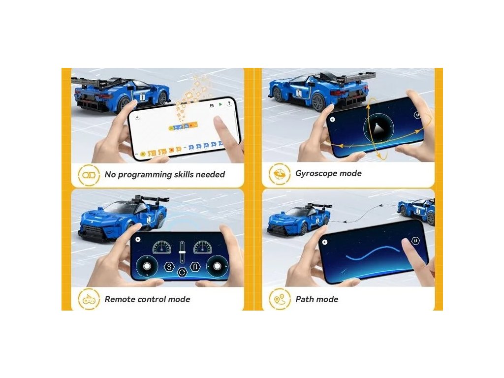 Pokročilé funkcie je možné využiť po prepojení s vašim telefónom pomocou aplikácie. Vďaka tomu je možné vozidlo ovládať pomocou gyroskopu, ručne kresliť mapku trasy, využiť pokročilé ovládanie všetkých funkcií alebo využiť jednoduché programovanie.Do diaľkového ovládača je potreba 2 x AAA batérie, do RC auta 3 x AA batérie. Rýchlosť športiaku je 3,8 km/h. Dosah diaľkového ovládania je 25 m. Rozmery zostaveného vozidla sú 21.2 x 11 x 5.8 cm.