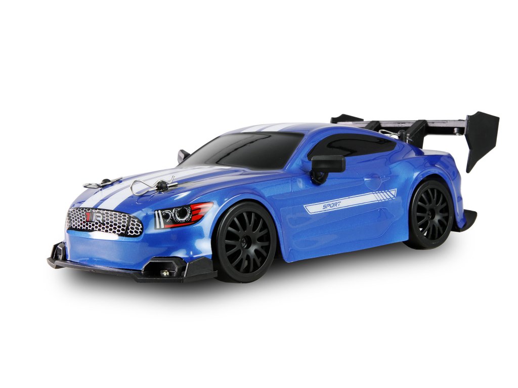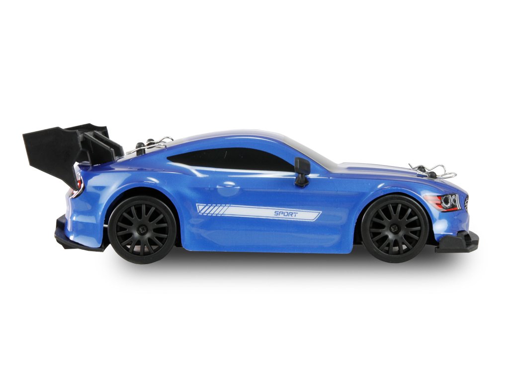 Replika športového vozidla Drift Racing Car, 4WD, mierka 1:24, 2,4 GHz, RTR, dve úrovne rýchlosti, LED osvetlenie, driftovacie pneumatiky, gumové pneumatiky, 4 kužele, farba modrá, vhodné pre začiatočníkov.