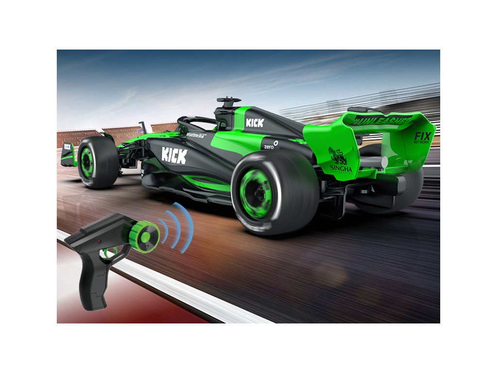 RC model formule je dodávaný s pištoľovým ovládačom, ktorý je tiež ladený do čierno-zelenej farby po vzore samotného auta. Diaľkové ovládanie funguje na frekvencii 2,4 GHz, nebude sa tak s vašimi ďalšími modelmi rušiť. Na sprevádzkovanie diaľkového ovládača potrebujete 2 x AA batériu, ktorá nie je súčasťou balenia.