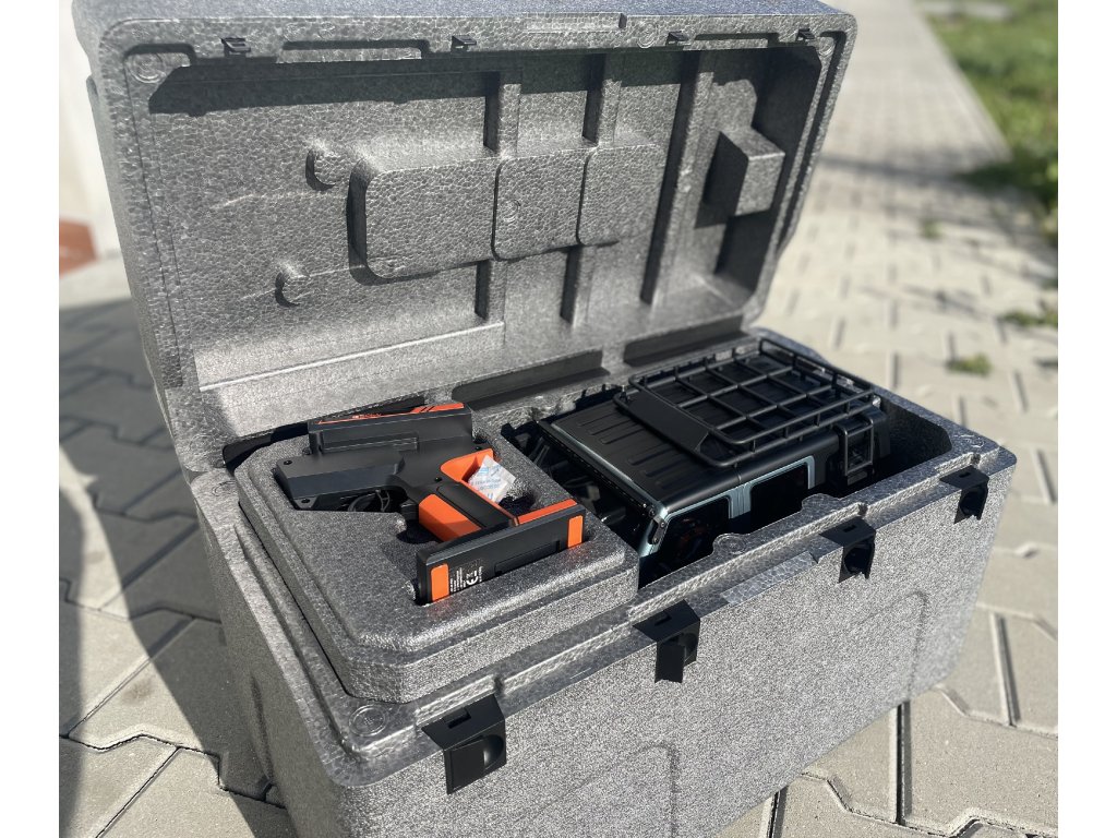 DF-4S PRO Crawler od DF Models je špičkový crawler najvyššej triedy s rázvorom 313 mm. Podvozok s oceľovým rámom je ukrytý pod krásnou karosériou s mnohými detailmi a interiérom s figúrkou vodiča. Karoséria je k podvozku pripevnená neodimovými magnetmi a ľahko sa odklopí dozadu. Kovové vzpery a tyče riadenia zaisťujú potrebnú stabilitu. Vertikálne uložené celohliníkové olejové tlakové tlmiče poskytujú perfektný výkon v akomkoľvek teréne. Riaditeľná 2-stupňová prevodovka umožňuje pomalú jazdu terénom (cca 3 km/h) a po preradení na druhý rýchlostný stupeň pomocou vysielača svižnú jazdu (cca 13 km/h). Elektromotor radu 550 môže byť napájaný 7,4 V LiPo batériou (tá nie je súčasťou dodávky), čo umožňuje extrémne dlhú dobu jazdy. Vďaka univerzálnemu držiaku batérie je možné použiť takmer akýkoľvek typ 2S LiPo batérie. Telo váhy je vybavené LED osvetlením (svetelná lišta, svetlomety, cúvacie svetlo, brzdové svetlo, blinkre). Elektrický navijak s oceľovým lankom je možné ovládať diaľkovým ovládačom. To sú iba štandardné funkcie DF-4S PRO Crawler... Tento model ale prichádza s mnohými ďalšími funkciami! Diferenciály modelu je možné rôzne zamykať alebo odomykať diaľkovým ovládaním (obaja odomknuté, oba zamknuté, iba predný zamknutý a zadný odomknutý). Náhon na kolesá je navyše redukovaný prevodovkou a umožňuje tak dokonalý výkon. Portálové (zvýšené) nápravy majú navyše efekt, že model má väčšiu svetlú výšku a nezachytáva sa na prekážky, ako je bežné pri štandardných nápravách. Diaľkové ovládanie je ďalšou prednosťou. Vďaka modro podsvietenému LCD displeju je možné sledovať stav batérií vysielača, silu prenosu vysielača, ktorý rýchlostný stupeň (nízky alebo vysoký) je zaradený, uhol riadenia v %, poloha plynu v %, stav trimu. Volant má prídavnú páku, pomocou ktorej je možné „ovládanie jednou rukou“. DF-4S PRO je dodávaný v odolnom prepravnom boxe so zámkami a madlom.