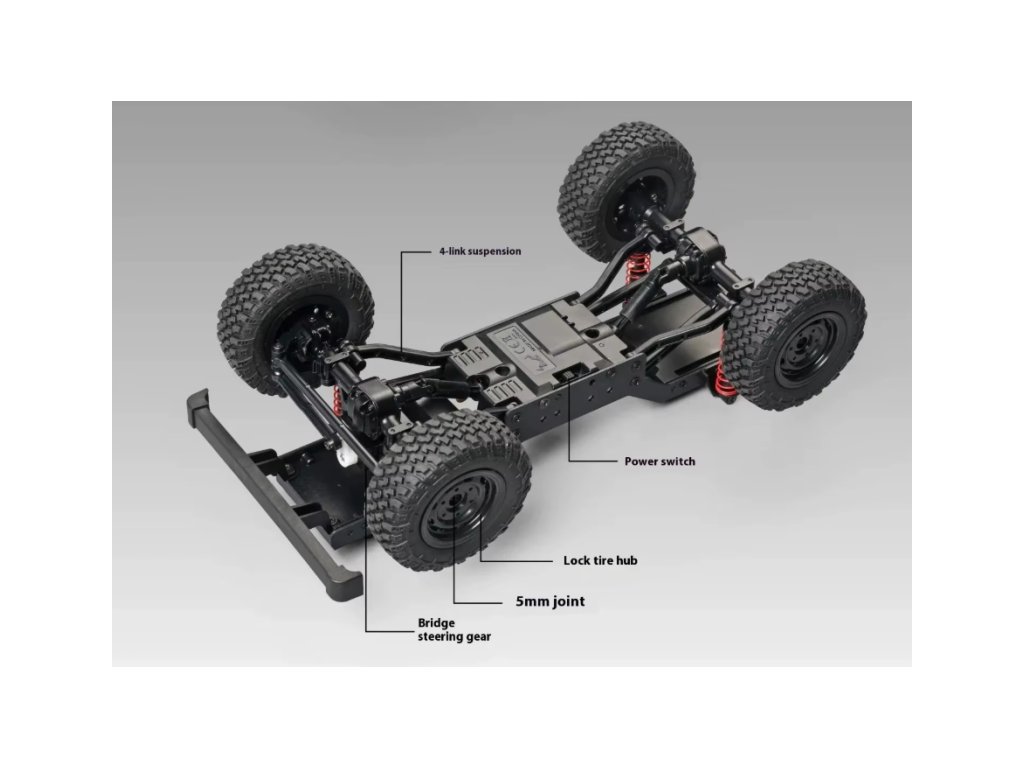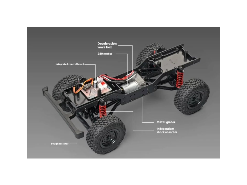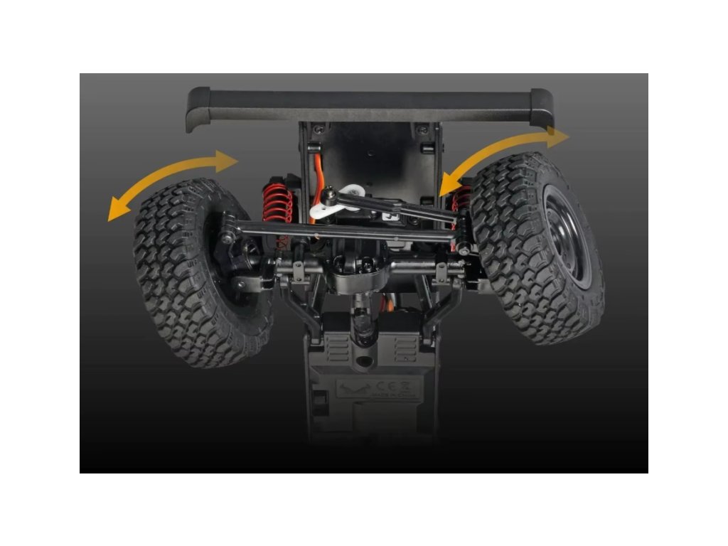 RC model auta je vyrobený z odolného, pružného plastu, vďaka tomu dokáže držať s deťmi tempo od ich útleho veku. Navyše sú k dispozícii dva rýchlostné režimy, medzi ktorými jednoducho prepínate pomocou tlačidla na diaľkovom ovládaní. Pre najmenších je vhodný pomalší režim, kedy model ide rýchlosťou cca 3 km/h. Skúsenejší vodiči využijú rýchlosť 6 km/h. Ide o RC auto do náročného terénu, kde vás rozhodne nesklame. Model je vybavený silným motorom 260, ktorý poháňa všetky štyri kolesá. Podvozok modelu je vystužený kovovým rámom. Pružinové tlmiče skvele absorbujú nerovnosti v teréne, v kombinácii s mäkkými pneumatikami a ich hlbokou vzorkou vás udržia na akomkoľvek povrchu. Vďaka pohonu všetkých 4 kolies a silnému motoru si poradí aj so stúpaním 30°. Na zadných dverách je umiestnené plnohodnotné piate koleso.