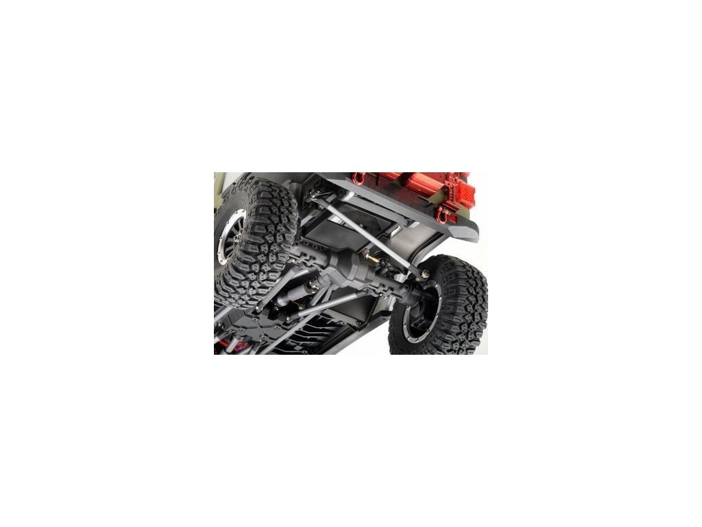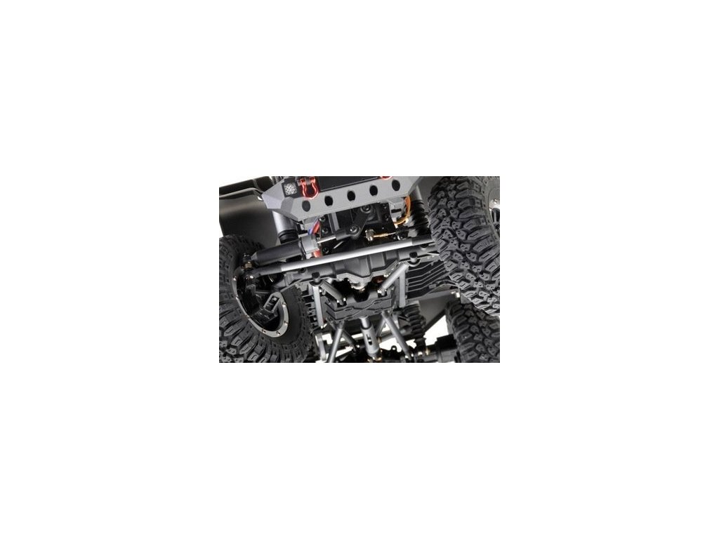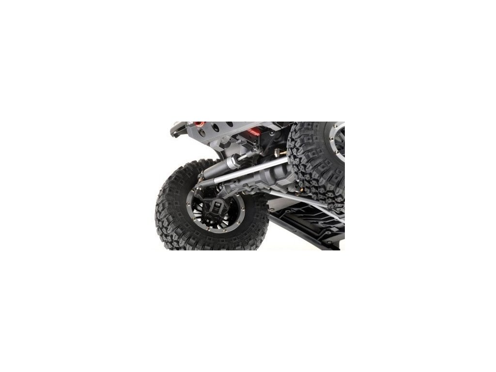 Portálové nápravy ponúkajú väčšiu svetlú výšku (vzdialenosť od skrine diferenciálu k zemi) ako konvenčné nápravy. Štýlové 1.9 palcové plastové beadlock disky a super mäkké pneumatiky s realistickým a funkčným vzorom pre maximálnu trakciu v akomkoľvek teréne. Pneumatiky majú rozmer 43 x 120 mm. Disky aj pneumatiky sú asymetrické, majú vnútorný priemer ráfika / pätky pneu väčší ako vnútorné podobne ako modely Short Course. Tvrdené oceľové hnacie hriadele na všetkých kolesách sú typu CVD, uhol riadenia predných kolies je 45,8°. Tlmiče sú olejové, kovové, s vnútornými pružinami a piestnicami zakrytými gumovými prachovkami. Prevody sú komplet zakrytované. Pastorok s prevodovým kolesom majú modul 32dp.