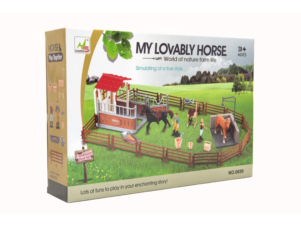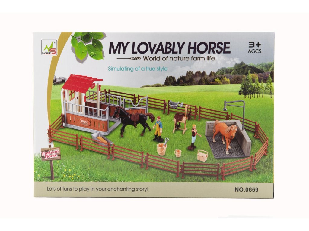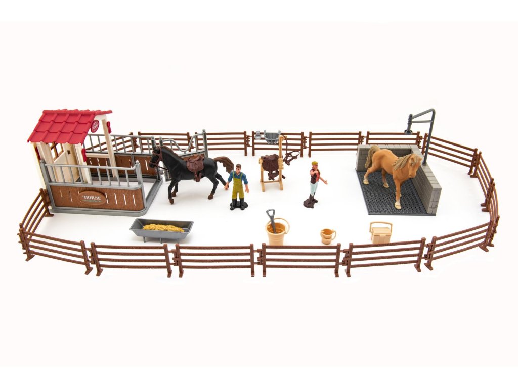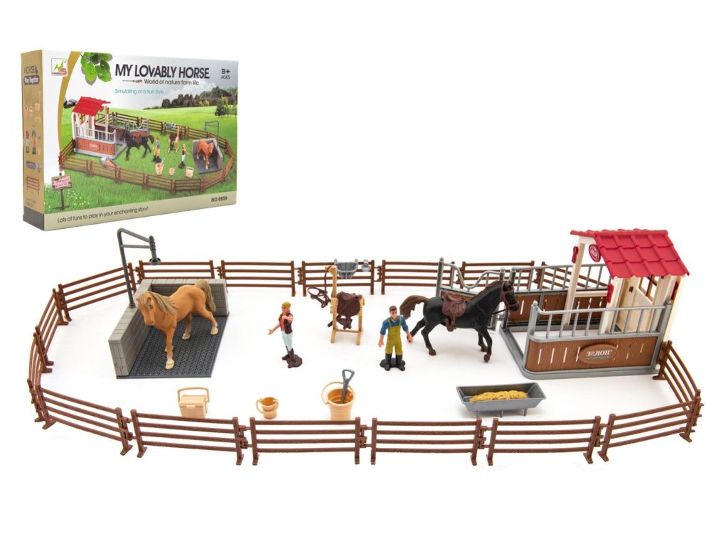 Výbeh / Ohrada pre kone + ošetrovatelia + kôň 2ks plast s príslušenstvom v krabici 39x27x8,5cm