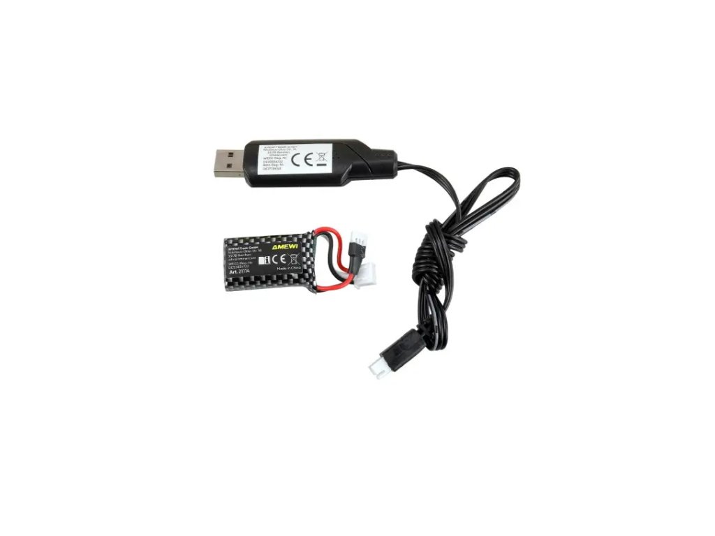 Súčasťou je nabíjací akumulátor Li-Po 300 mAh 7,4 V s 3P MLX konektorom, ktorý ľahko nabijete priloženým USB káblom za cca 20 minút. Výdrž akumulátora je cca 15 minút na jedno nabitie. V balení je aj 6 kužeľov pre postavenie závodnej trasy.