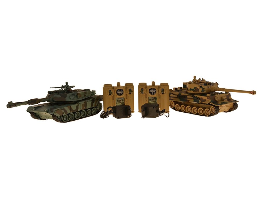 RC sada bojujúcich tankov GERMAN TIGER vs ABRAMS s infra delami a simuláciou boja pre dvoch hráčov. Teraz na 2,4 GHz.