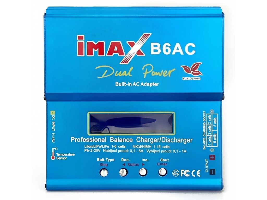 Nabíjač a vybíjač s balancerom 50W pre 1-15 článkov NiCd/NiMh, 1-6 článkov LiPo/LiIon/LiFe, 2-20V Pb prúdom 0,1-5A. Vybíjanie max. 1A. Vstup tepl. čidlo, vypínanie podľa teploty, kapacity, času. Napájanie DC12 V/100-240V so vstavaným sieťovým zdrojom.