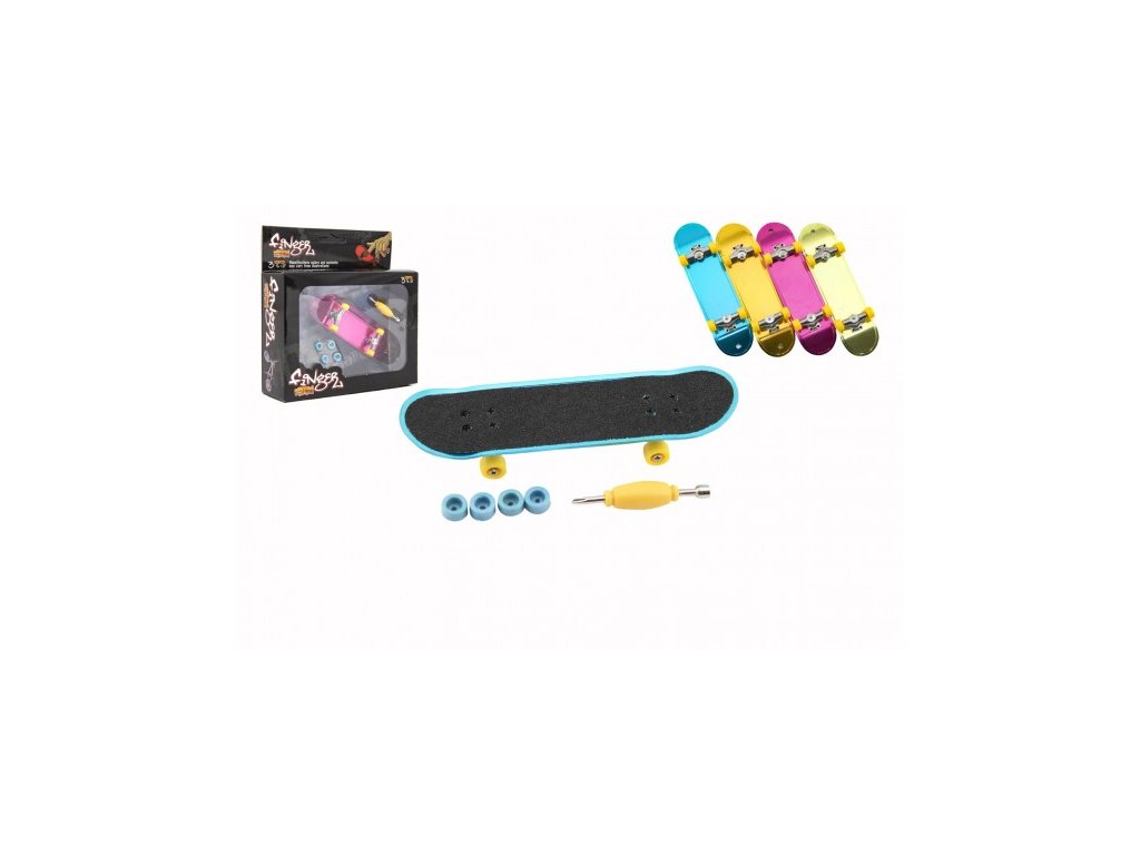 Skateboard prstový skrutkovacie plast 9cm s doplnkami 4 farby v krabičke 14x14x4cm