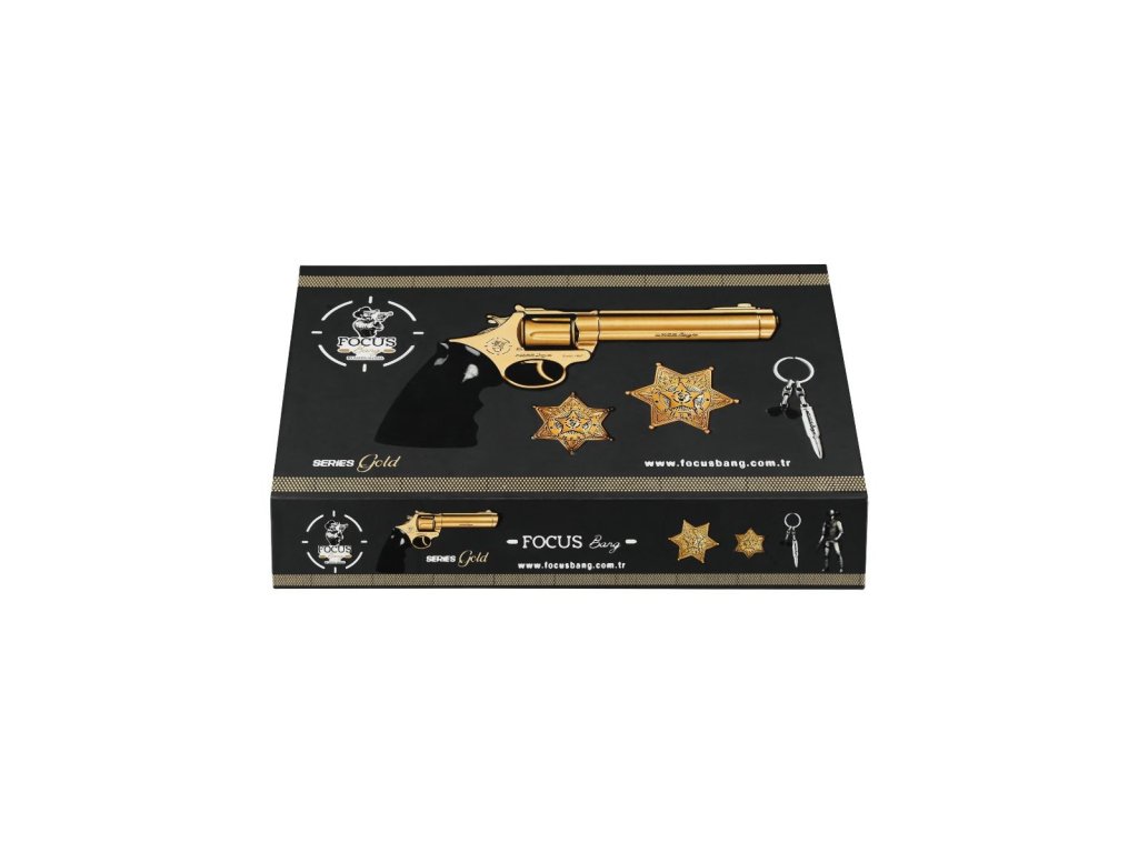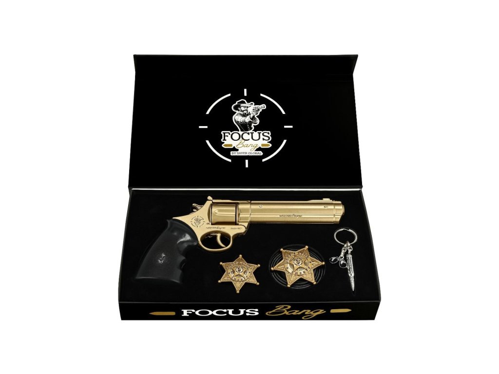Zlatý kovový revolver na kapslíkové kotúčiky, opasok na zbraň + kľúčenka + odznak šerifa, farba zlatá. Krásne prevedenie, hmotnosť 0,84 kg