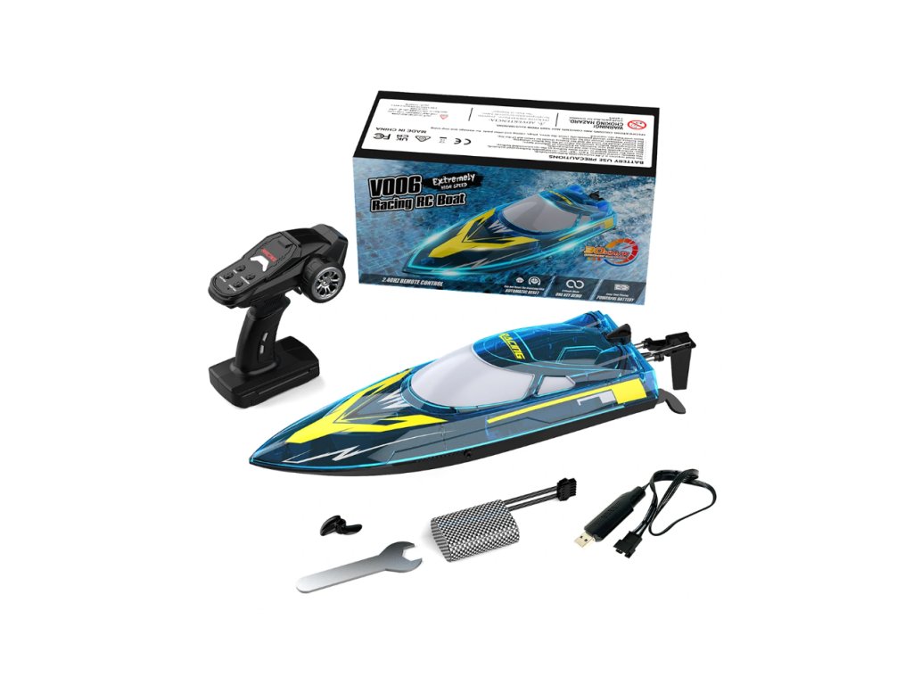 Loď V006 je rýchly čln na diaľkové ovládanie, vybavený tempomatom. Rýchlosť, ktorá vám vyhovuje si jednoducho „zafixujete“ pomocou tlačidla. Túto funkciu môžete využiť na bezpečnú plavbu na menšej vodnej ploche, alebo z nej urobiť ideálnu RC loď pre deti a rýchlosť tak prispôsobovať ich schopnostiam. Ďalšou funkciou je DEMO, pomocou tohto tlačidla loď pláva v tvare 8.