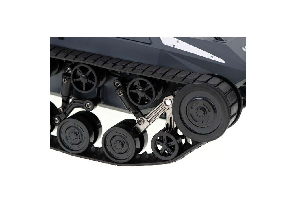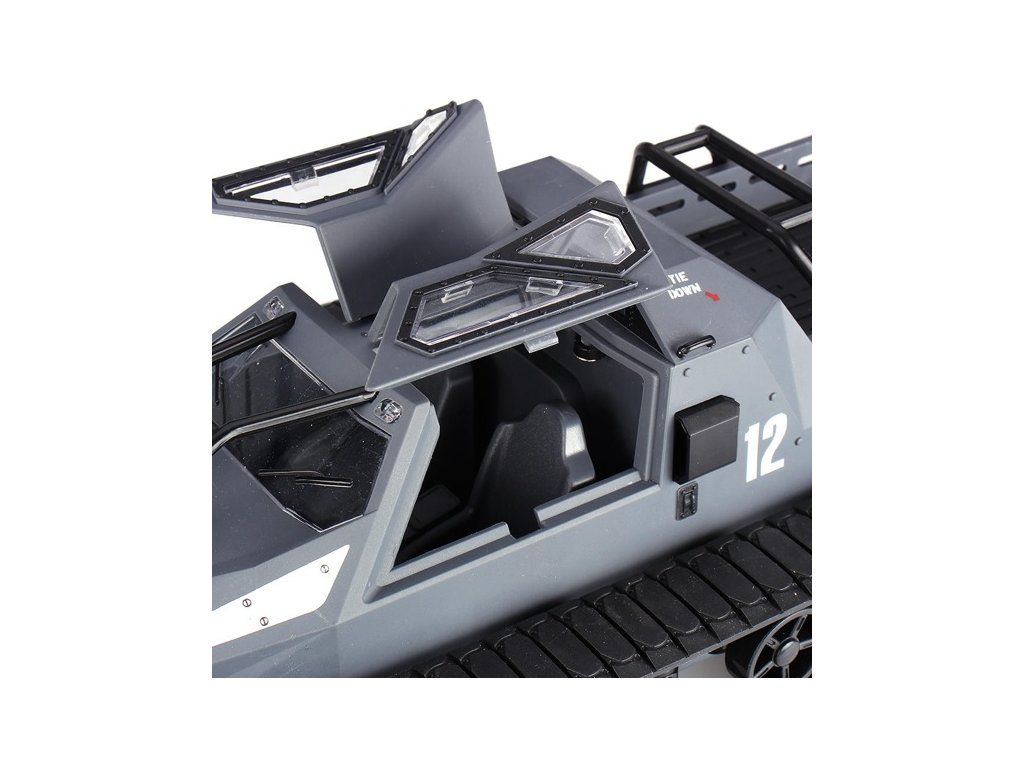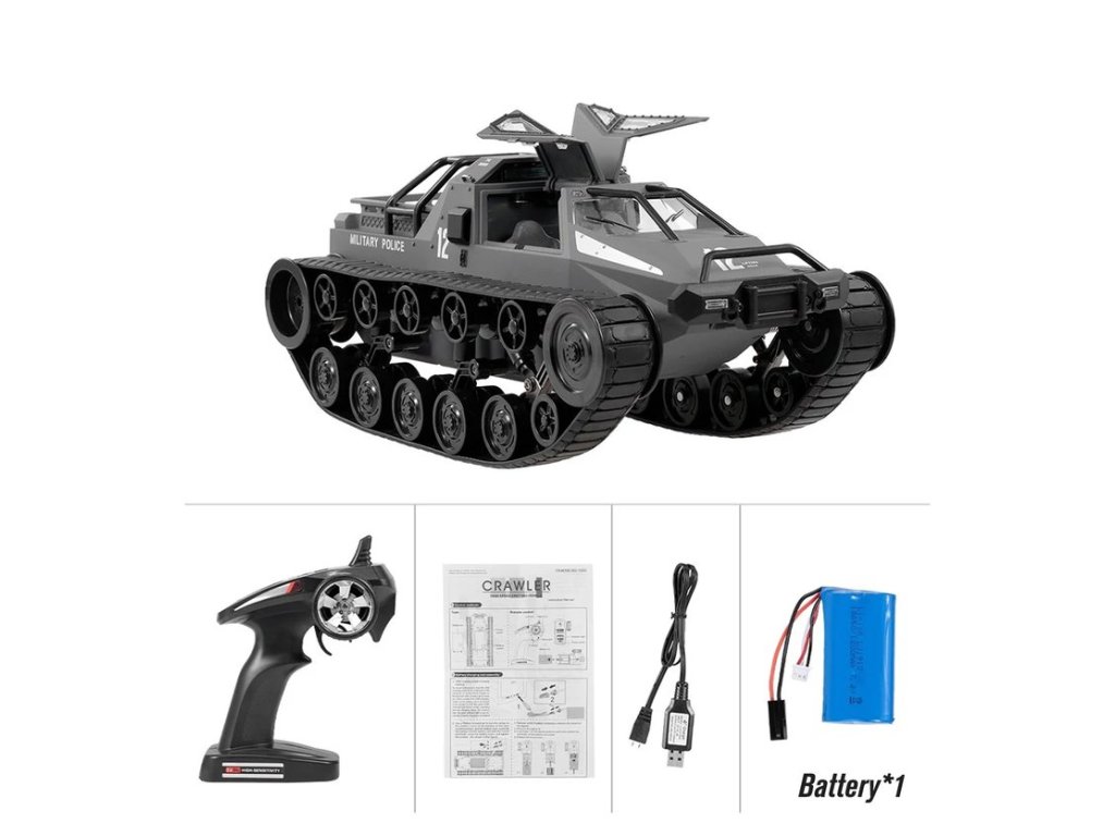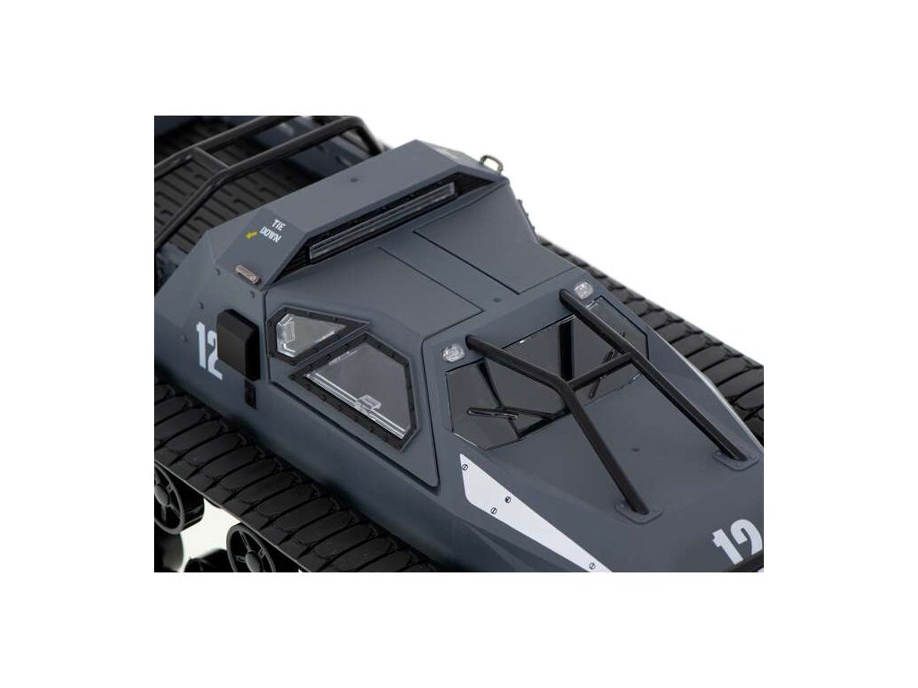 MILITARY POLICE Crawler 1:12 je futuristický pásový rc model do tých najextrémnejších terénov nielen vďaka svojej svetlej výške 5 cm, rázvoru pásov 10 cm a odolnosti podvozku proti striekajúcej vode. Pasák je celoodpružený s kovovou prevodovkou, ktorá má 2 diferenciály s maximálnou rýchlosťou až 12 km / h s proporcionálnym plynom. Pásy sú napínané vodiacimi kolieskami, ktoré sú zavesené na kovových ramenách a zamedzujú tak spadnutie pásu za jazdy. Na prvý pohľad zaujme nielen svojím vzhľadom, ale aj robustným kvalitným spracovaním. Model sa ovláda volantovým ovládačom 2,4 GHz, je možné otvárať dvierka či svietenie LED osvetlením za zlých svetelných podmienok. Model môže "šplhať" až do 30 ° náklonu a vie tiež 360 ° točky na mieste.