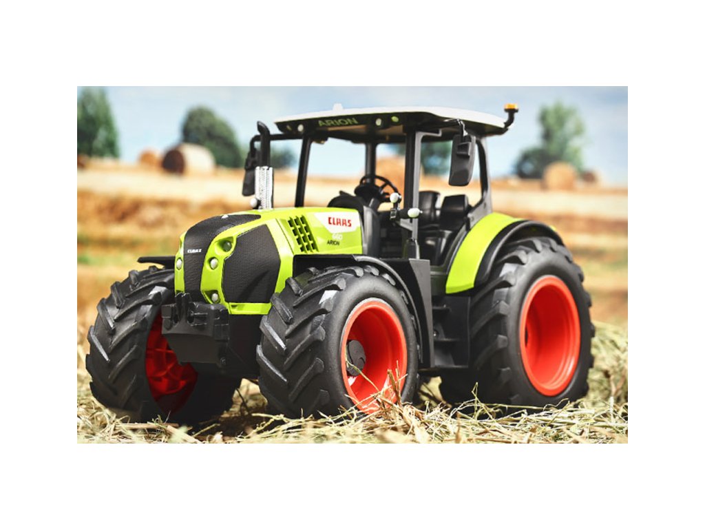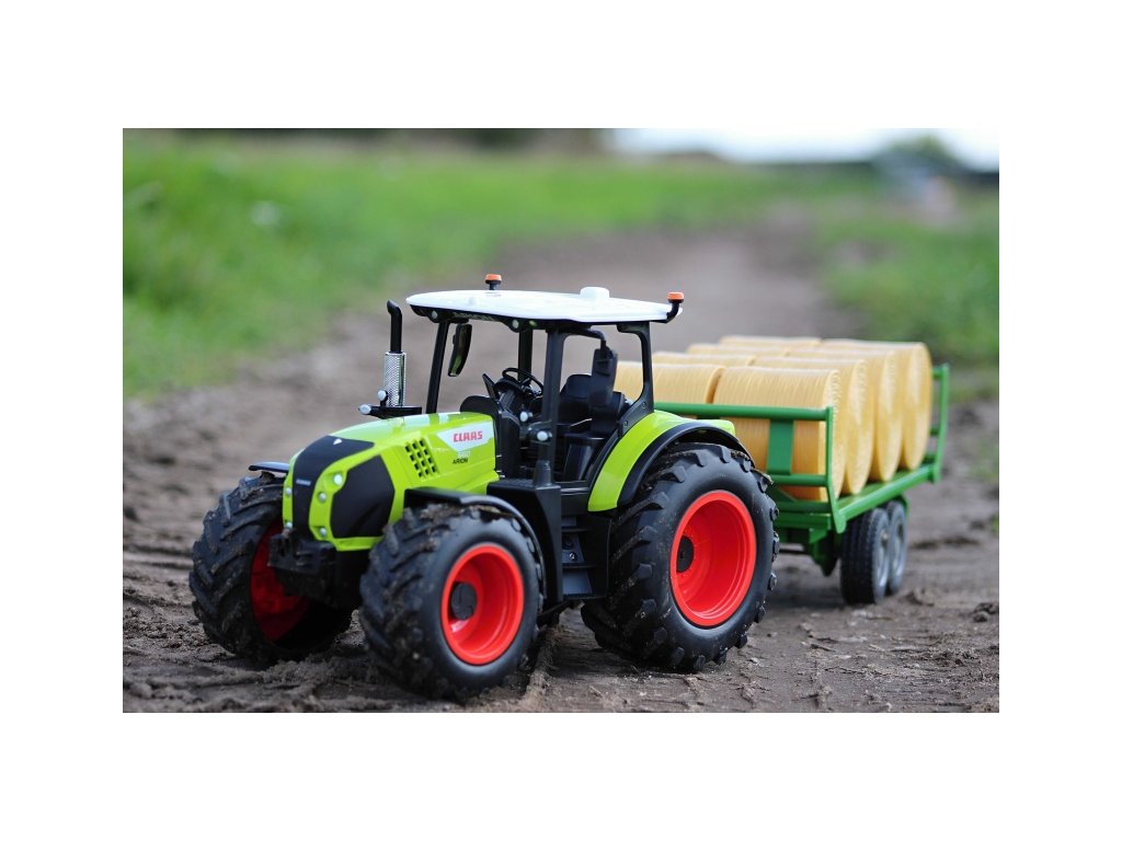 RC traktor ARION CLAAS 1/16 s valníkom a balíkmi slamy
