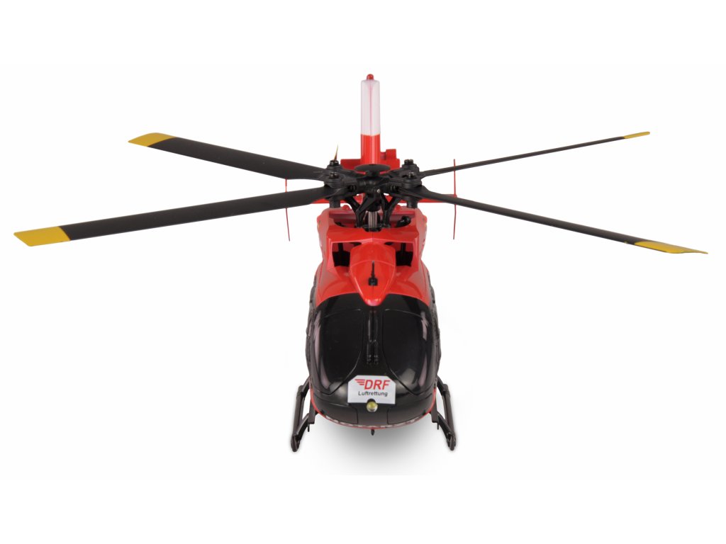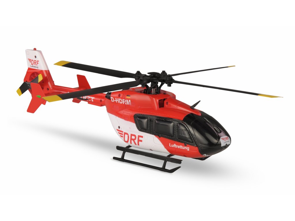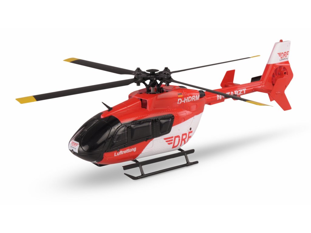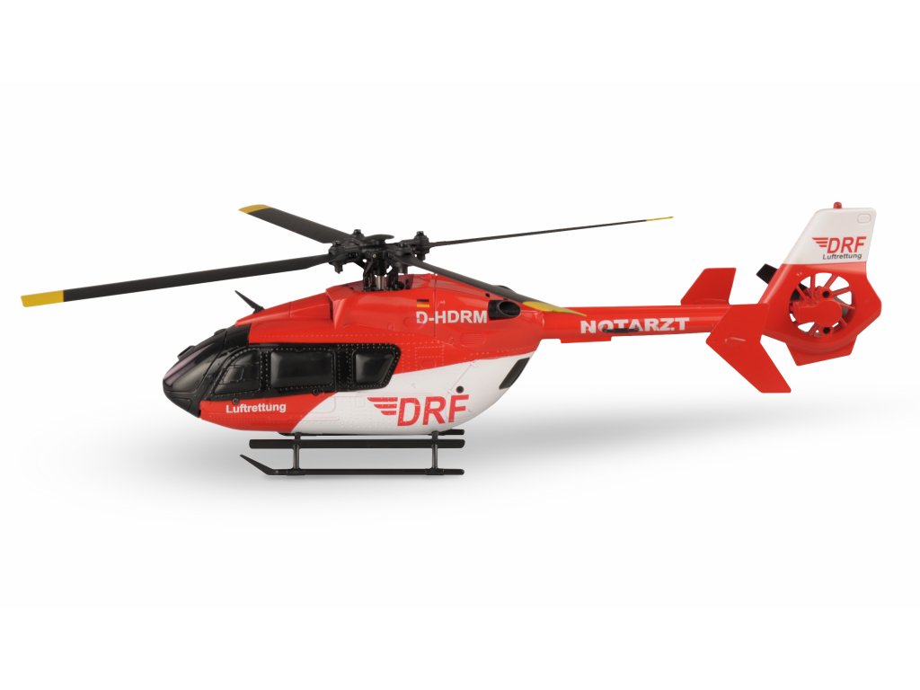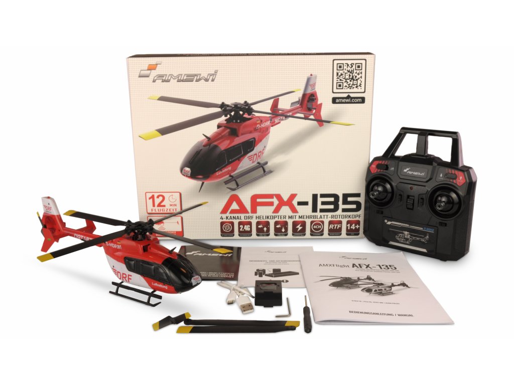 Replika známeho vrtuľníka s náterom vo farbách nemeckej leteckej záchrannej služby DRF - AFX-135 má početné detaily, ktoré úplne zodpovedajú originálu. Aj jednotlivé nity kabíny, ktorá je vyrobená z pevného plastu. Tento zmenšený vrtuľník má LED osvetlenie vpredu aj vzadu, ktoré završuje pôsobivý vzhľad. Vďaka kvalitnej elektronike vrátane automatického štartu a automatického pristátia je letové správanie príjemné a vrtuľník je aj napriek viaclistovej rotorovej hlave vhodný pre začiatočníkov. s integrovanou inteligentnou batériou je doba letu približne 7-9 minút Zvláštnosťou je nabíjacia zásuvka USB, ktorá je zabudovaná do batérie, ktorú jednoducho pripojíte k priloženému USB káblu. Batérie a model majú funkciu sledovania napätia (LED začne blikať, keď napätie klesne). To znamená, že pilot vždy vie, kedy je lepšie začať spiatočný let. Vysoko kvalitný 2,4 GHz vysielač, ktorý dobre padne do ruky, má tri rôzne letové fázy (od začiatočníka po pokročilých), hliníkové kniple a možnosť prepnutia z režimu MODE 2 (pri dodaní) do režimu MODE 1. AFX-135 DRF je dodávaný ako RTF verzia (Ready-to-Fly), teda všetky komponenty – okrem štandardných AA batérií do diaľkového ovládania – sú už súčasťou balenia a vrtuľník môže lietať ihneď po nabití batérie.