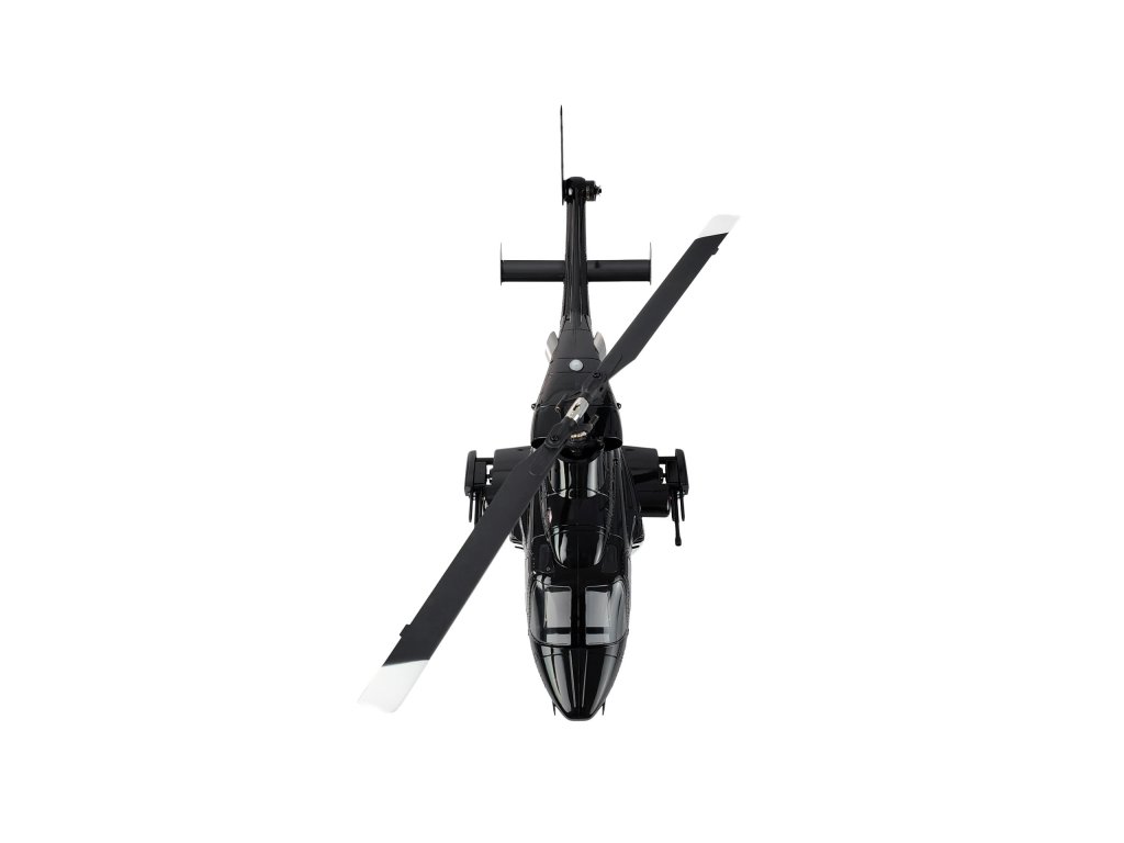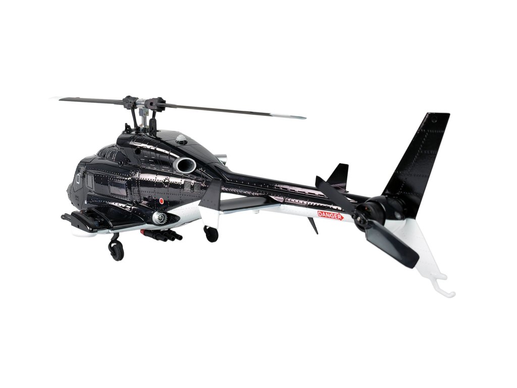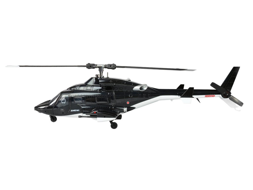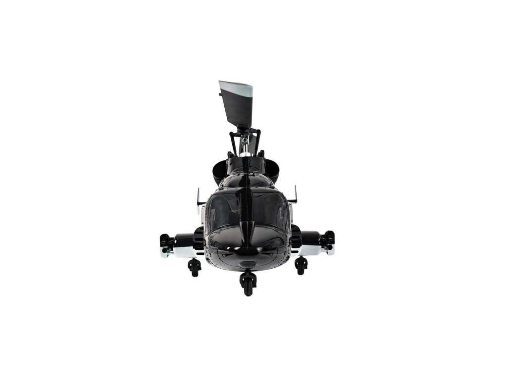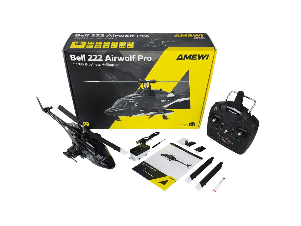 Bell 222 je dvojmotorový civilný vrtuľník vyvinutý v 70. rokoch 20. storočia a dodávaný od roku 1980. Vizuálne upravená verzia si získala zvláštnu slávu vďaka televíznemu seriálu Airwolf. Tu prezentovaný model je replikou vrtuľníka Airwolf v mierke s množstvom detailov inšpirovaných originálom: Čiernobiele lakovanie, repliky palubnej výzbroje a integrované LED osvetlenie zdôrazňujú jeho charakteristický vzhľad. Trup je vyrobený z robustného ABS plastu. Hlava rotora a časti cykliky sú vyrobené z hliníka. Poháňa ho striedavé motory s 1200 kV na hlavnom rotore a 5500 kV na chvostovom rotore. V kombinácii s dodávanou 7,4V 1200mAh LiPo batériou to vedie k výkonnej jednotke pre dynamické letové manévre. Na asistenciu letu sú inštalované rôzne senzory. 6-osý gyroskopický systém (6G), barometrický výškomer a optický výškomer zaisťujú stabilný let. Diaľkové ovládanie ponúka funkciu dvojitého nastavenia pre nastavenie rôznych výchyliek serv, vďaka čomu je model vhodný ako pre začiatočníkov, tak pre pokročilých pilotov. Výchylky cykliky sú zaistené štyrmi digitálnymi mini servami 4,3 g s kovovými prevodmi a dobou odozvy 0,05 sekundy na každých 60 stupňov. Model je vybavený funkciou letu na chrbte, ktorú je možné aktivovať pomocou diaľkového ovládania od výšky približne 5 metrov. Stavová LED dióda v hornej časti modelu indikuje aktuálny stav batérie. Rozsvieti sa varovná kontrolka, keď je batéria takmer vybitá, a pokiaľ nie je vykonaná žiadna akcia, nasleduje automatické pristátie. Vzlet je možný v režime 2 (plyn vľavo) aj režime 1 (plyn vpravo). V režime letu so senzormi je maximálna letová výška obmedzená na približne 8 metrov.