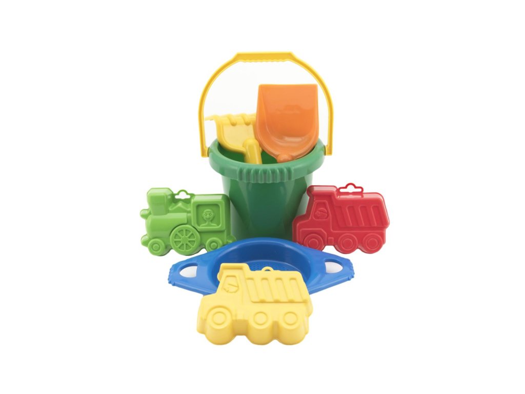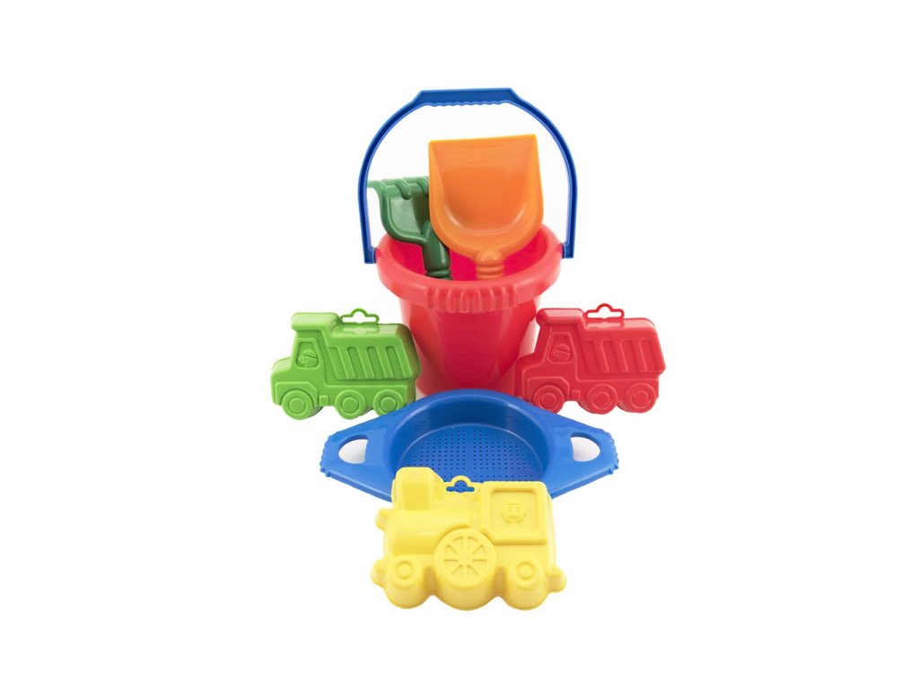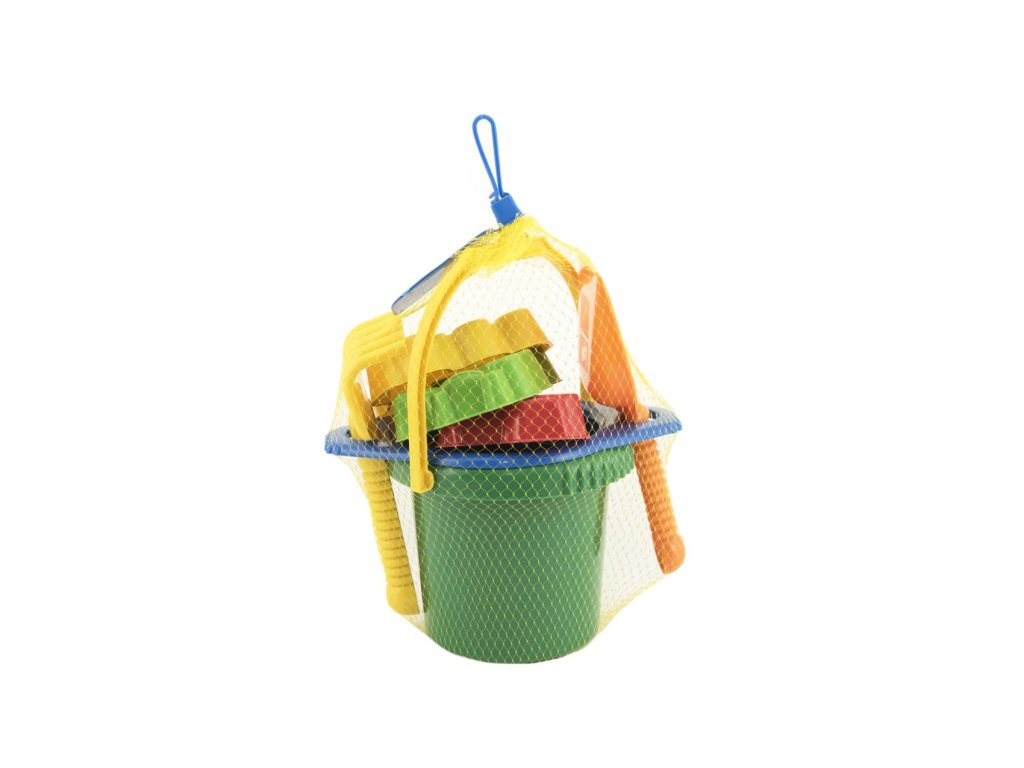 Vedro sitko lopatka hrabličky 3 bábovky plast v sieťke 12m+