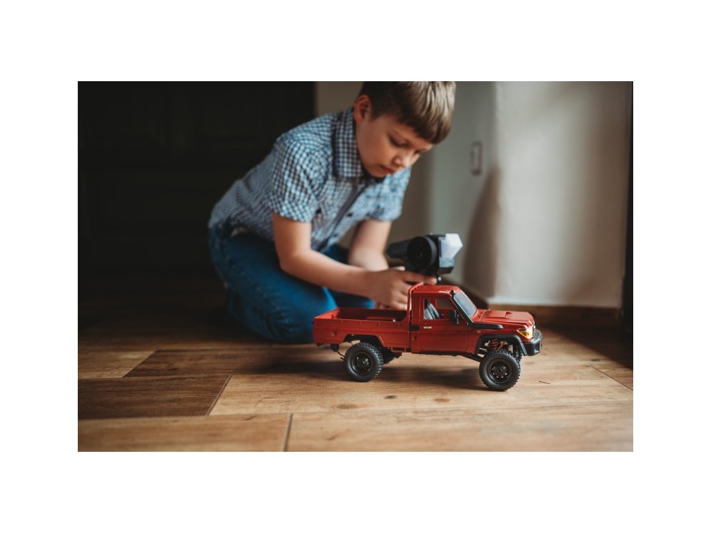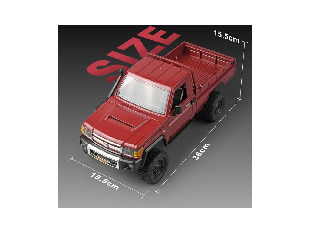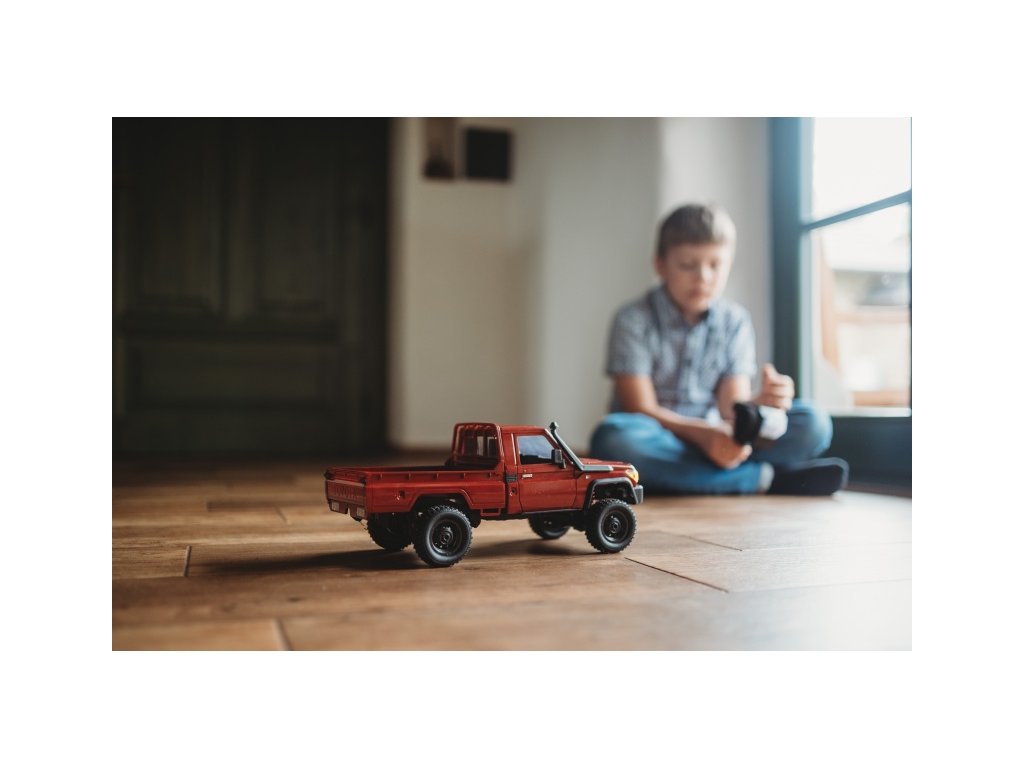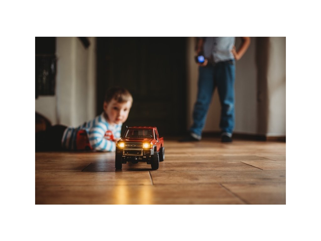 Veľmi precízne spracovaný model na diaľkové ovládanie je pick-up licencovaný firmou Toyota. Vyrobený je z kvalitného a odolného plastu. Dizajn je vyladený do posledného detailu vrátane interiéru kabíny. Auto s korbou môžete využiť na pomalú jazdu terénom alebo prevážanie materiálu či plyšových kamarátov. Zadná strana korby sa dá ručne sklopiť na uľahčenie vykládky.